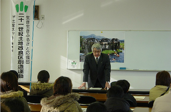 親子施設見学会 事務局長の歓迎のあいさつ コンピューター管理システムを説明しています 参加者全員の記念撮影です 調整池の役割について説明しています 花卉団地のシクラメンの見学 参加者全員でグラウンドゴルフを楽しみました(第二調整池上、飯丘スポーツ公園)